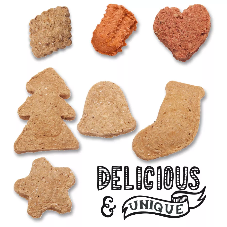 Jeden Tag bis Weihnachten darf Ihr Hund ein Türchen öffnen und sich über mehrere schonend gebackene Leckerlies in verschiedenen Geschmacksrichtungen freuen – mal herzhafter Truthahn, mal leckere vegetarische Varianten. So wird jeder Dezembertag zu einem kleinen Fest voller Überraschungen und Freude!